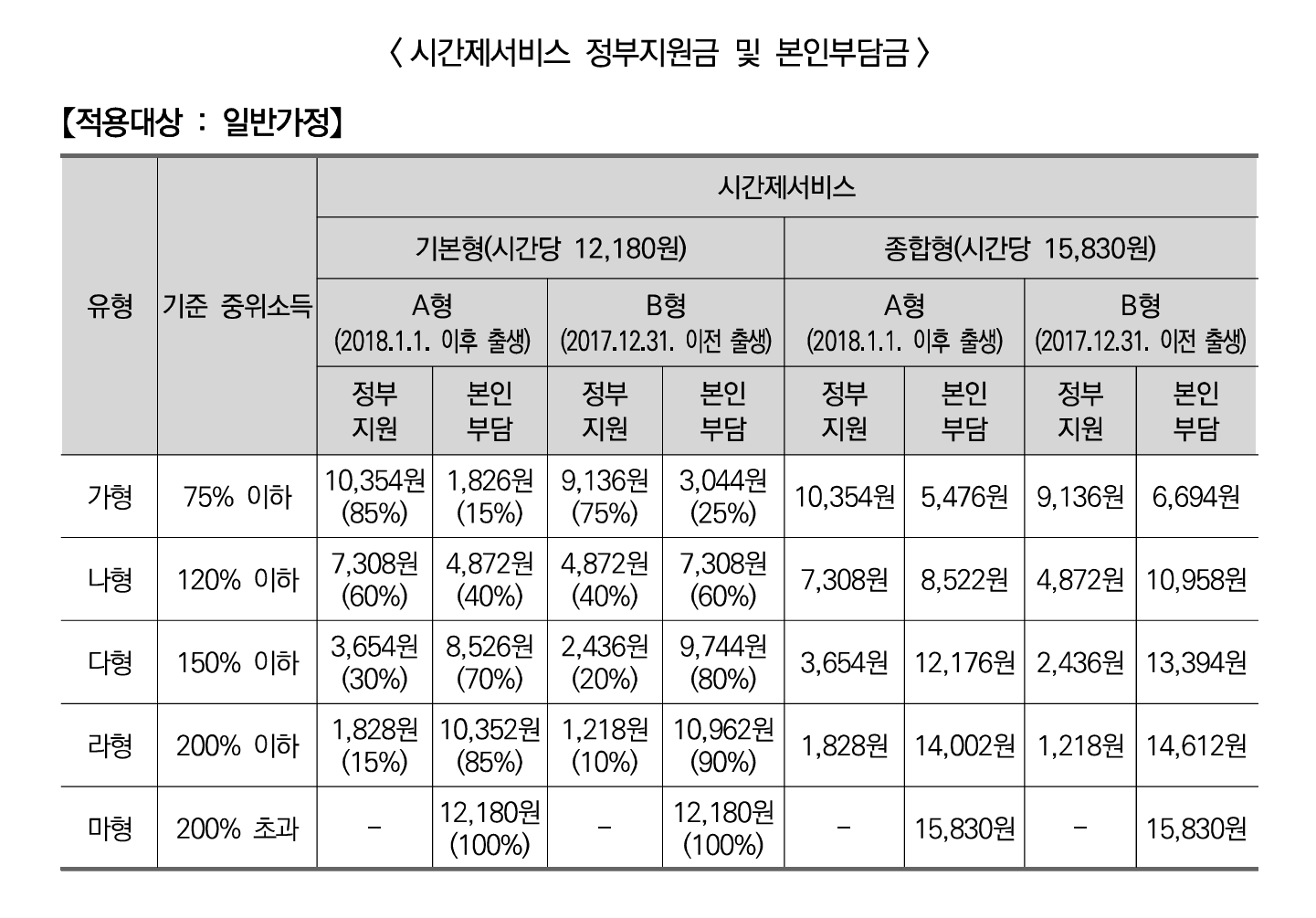 - 본인 부담금 및 정부 지원 비율은 가구 소득 기준에 따라 다르며, 예외적 면제 대상도 있음.
